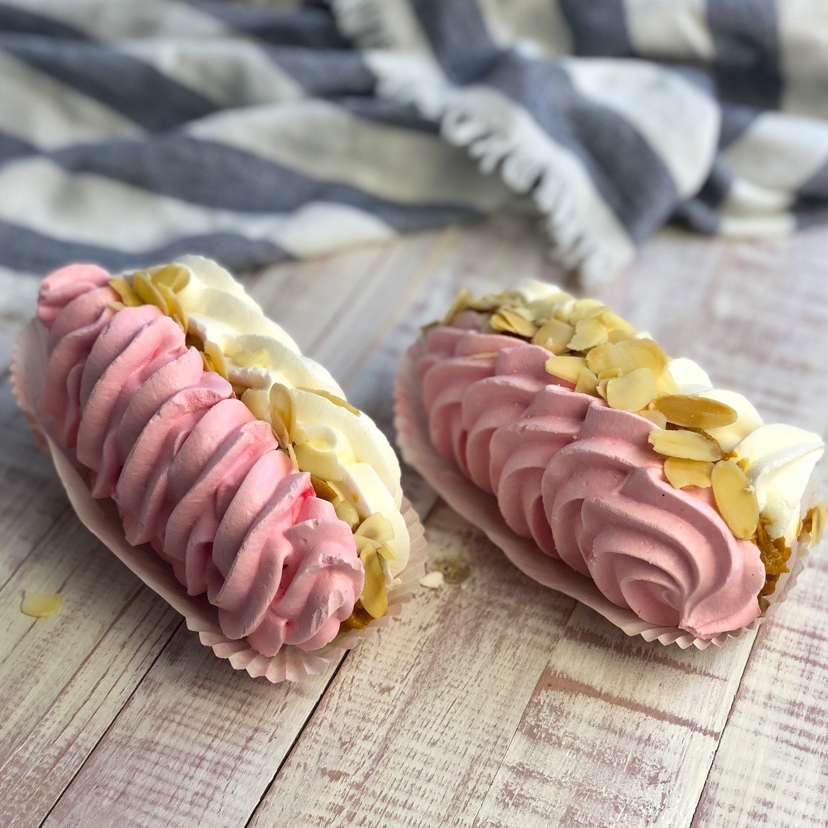 Безе с прослойкой из вареной сгущенки и миндальными лепестками.