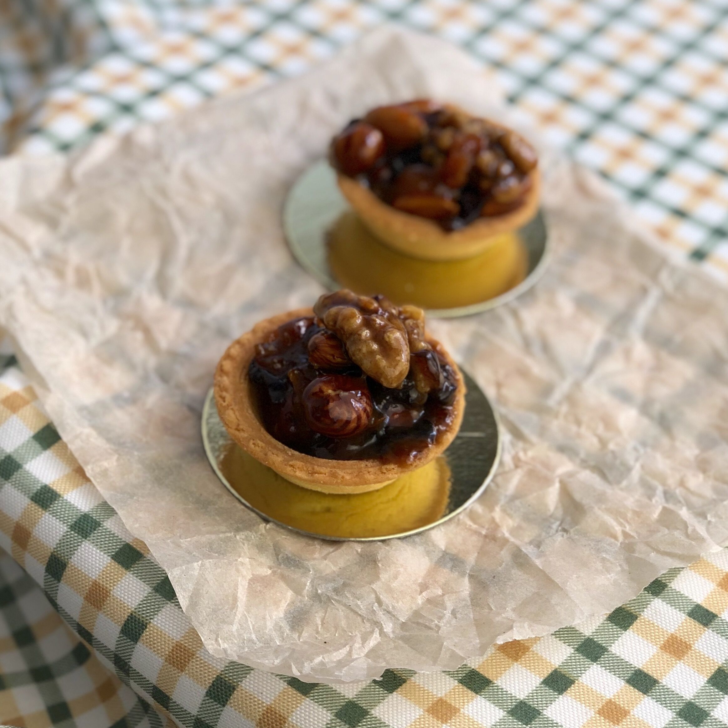 Песочная корзинка с миксом из миндаля, фундука и грецкого ореха, чернослива и кураги под медовым соусом.