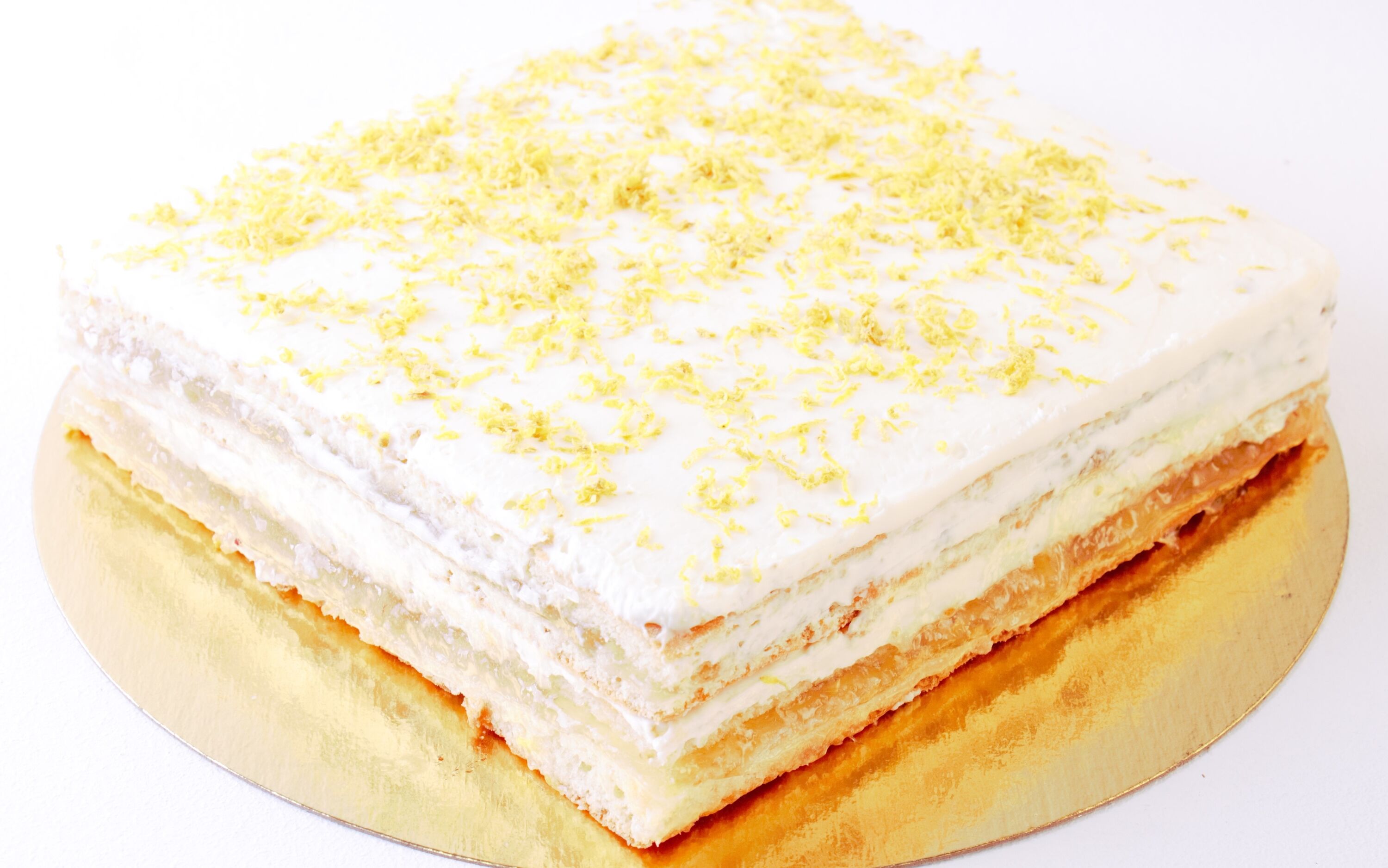 Слоеное рубленное тесто в сочетании с двумя видами крема. Крем на основе сгущеного молока и сливочного масла и крем на основе сока и мякоти лимона.