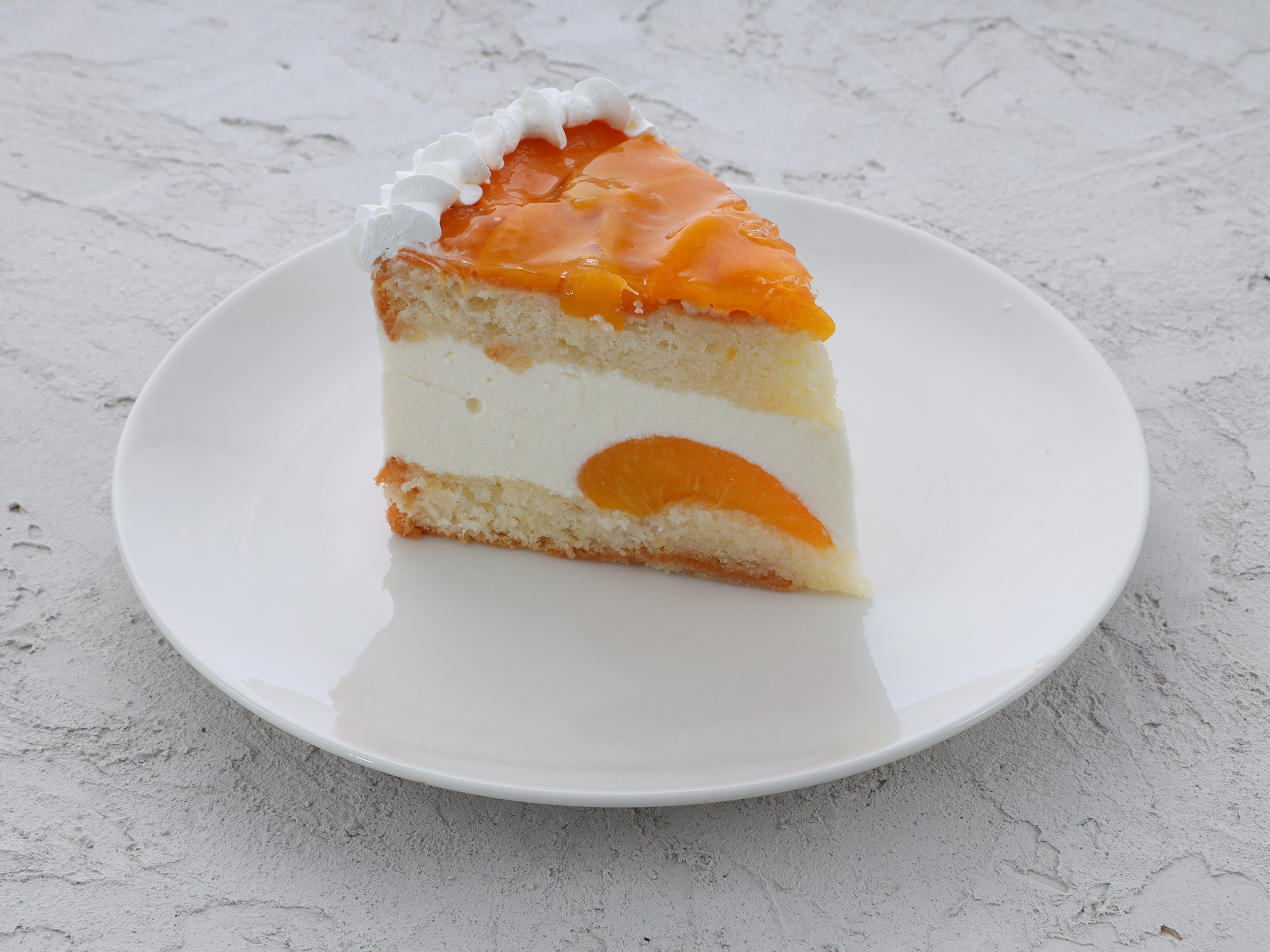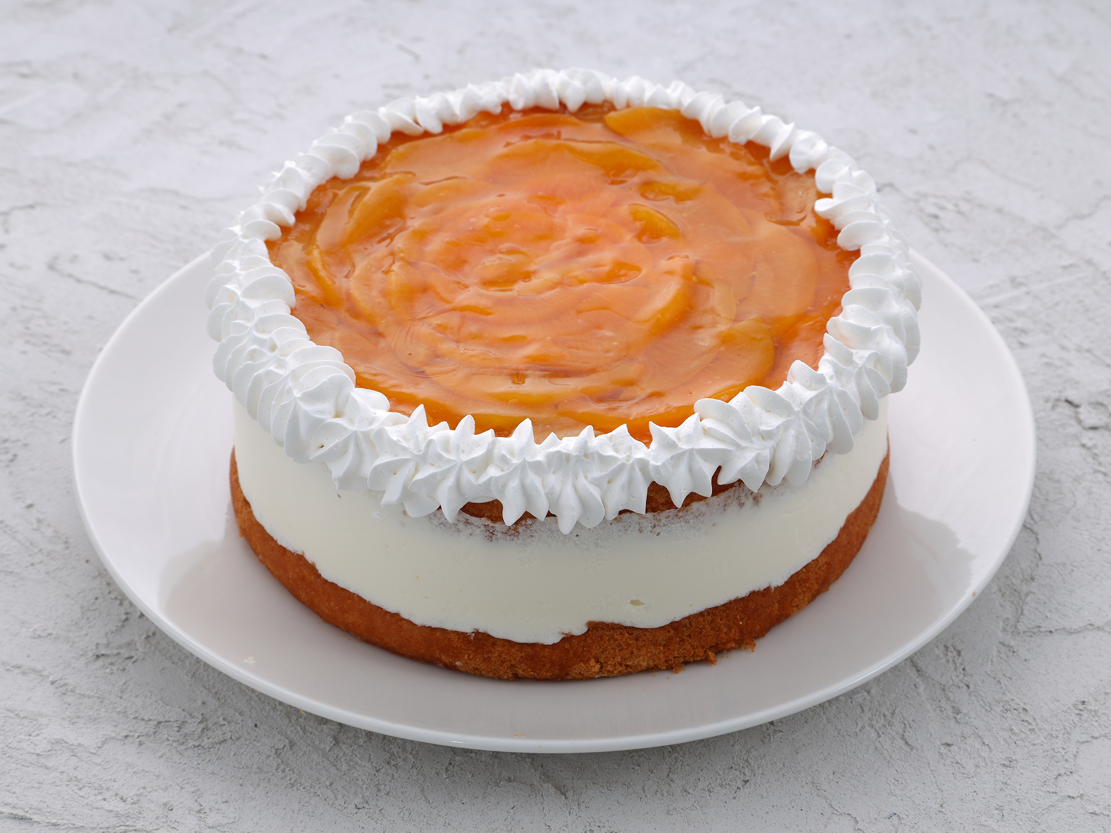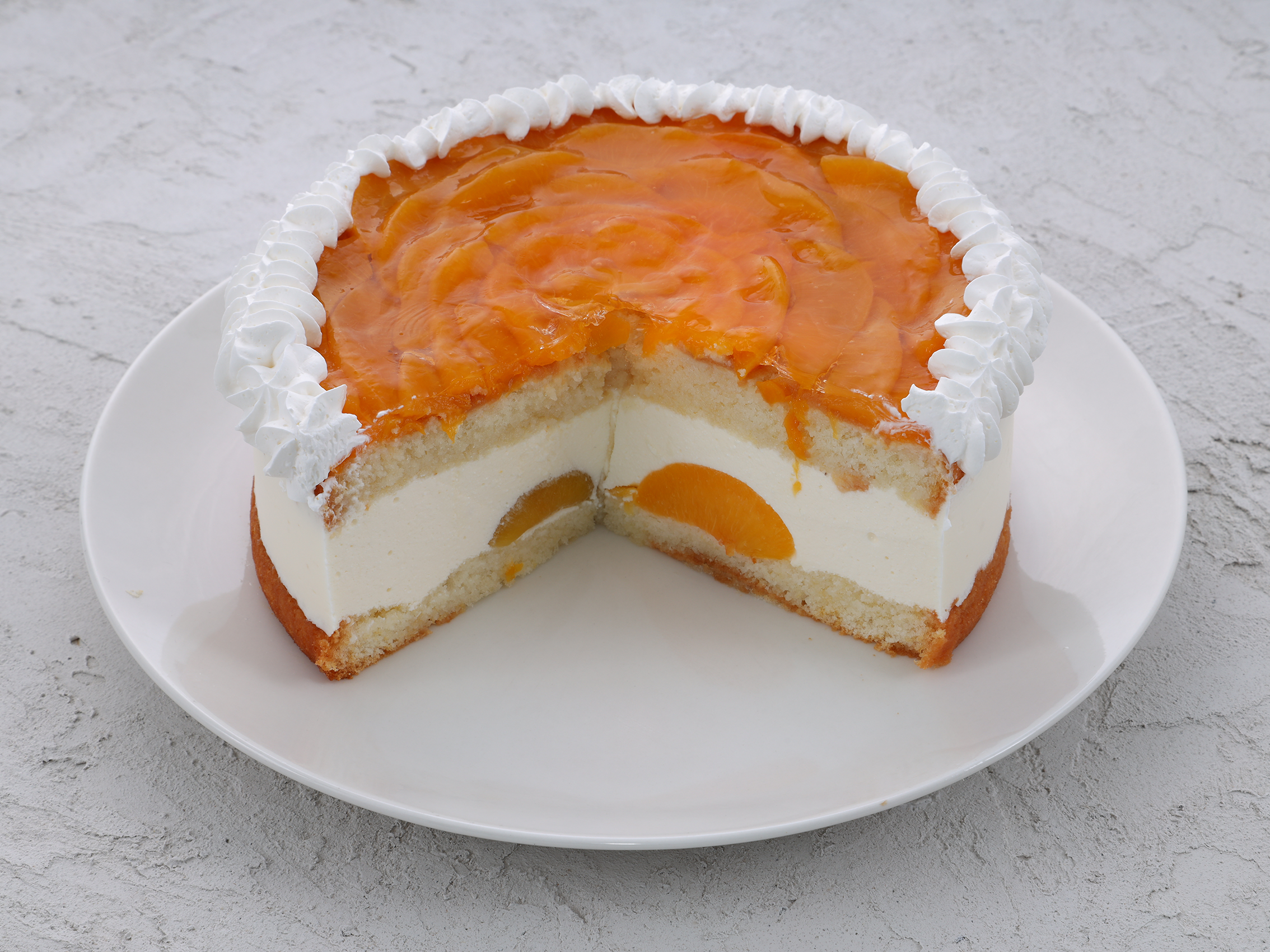 Два белых бисквитных коржа с прослойкой из нежного творожно-йогуртового суфле с кусочками персиков. Покрыт желе с дольками персиков и украшен взбитыми сливками.