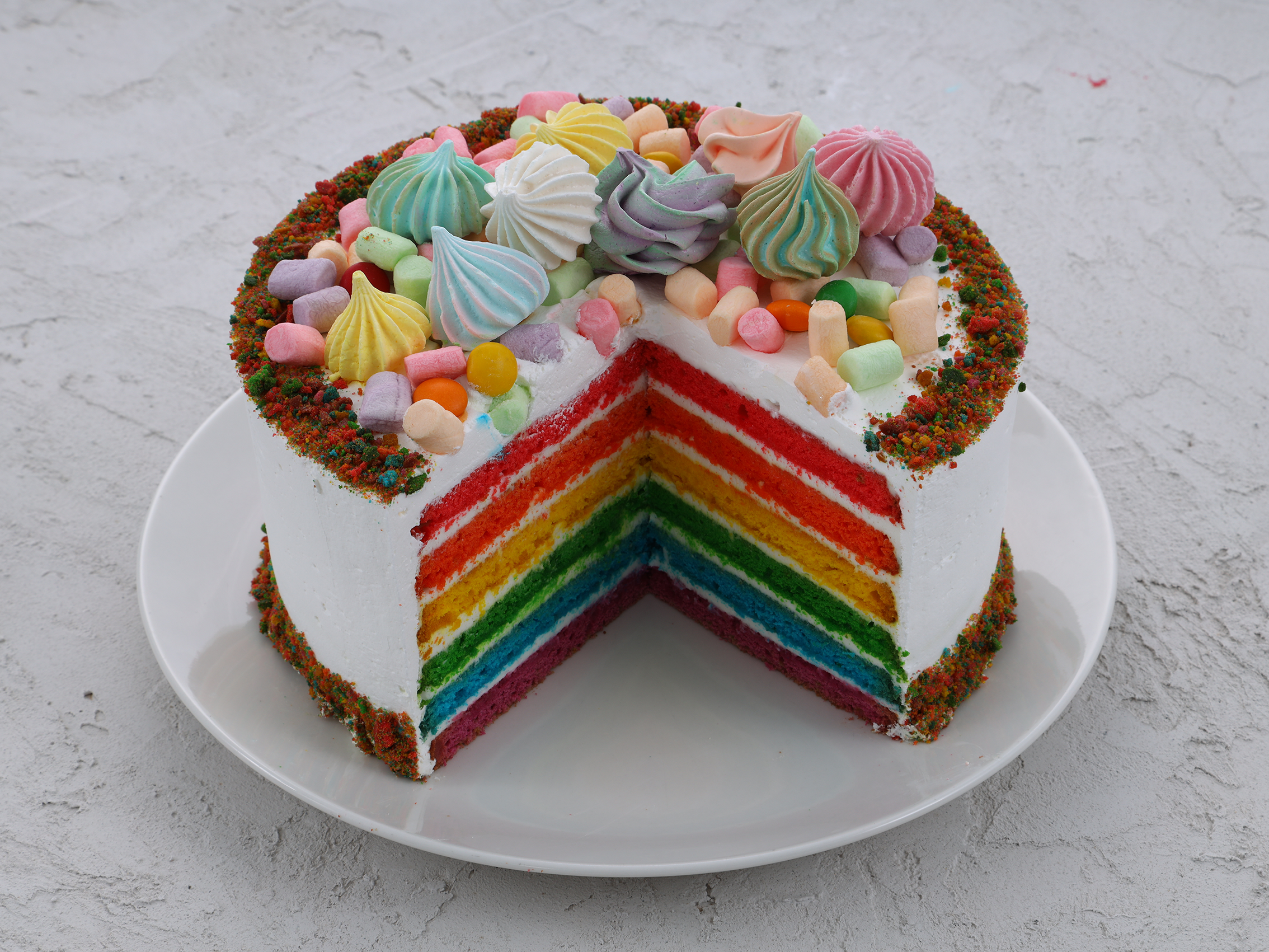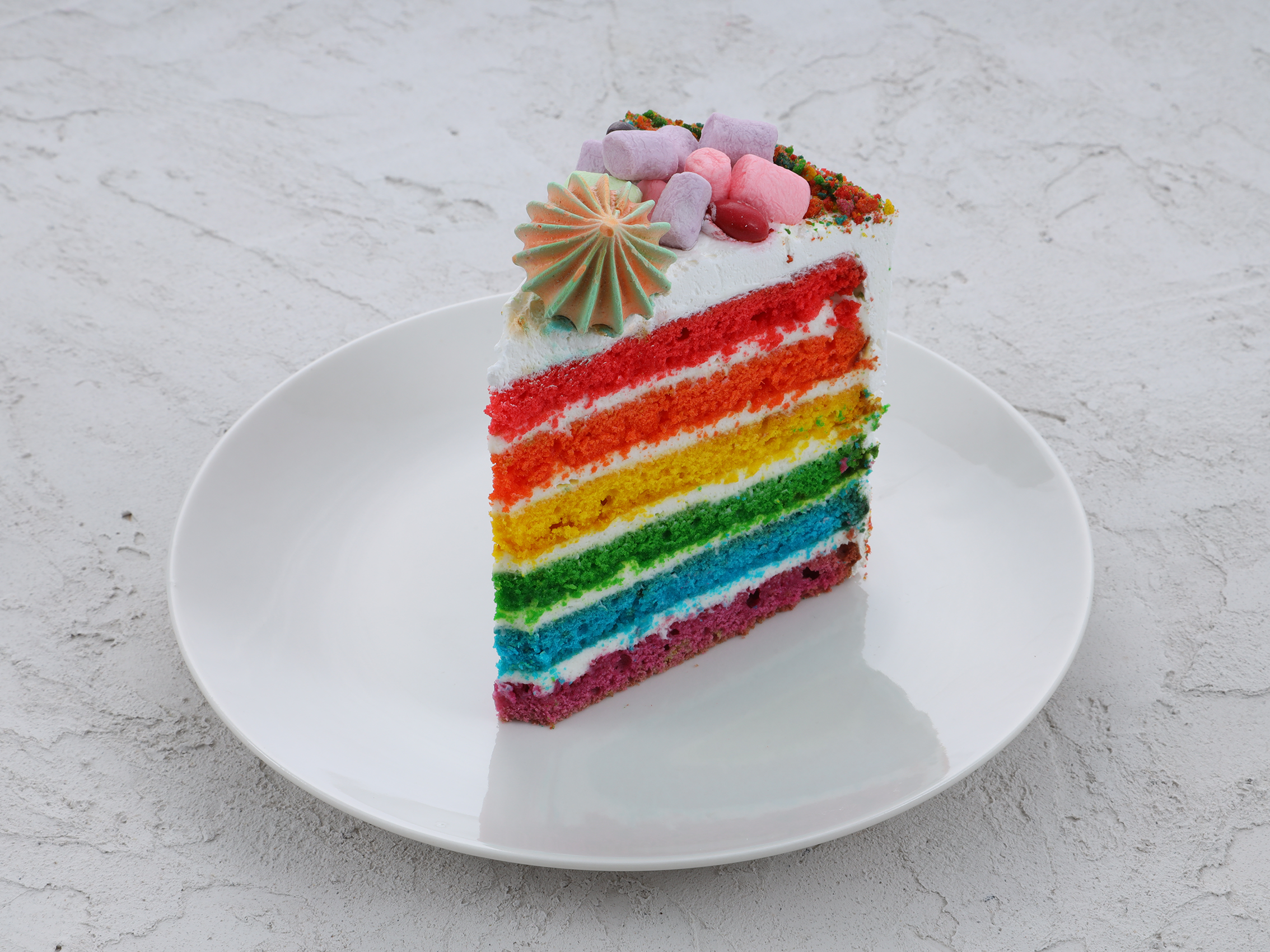 Цветные бисквиты, пропитанные лимонным соком, с нежным сметанным кремом в прослойке. Оформлен разноцветным драже, безе и маршмеллоу. ⠀