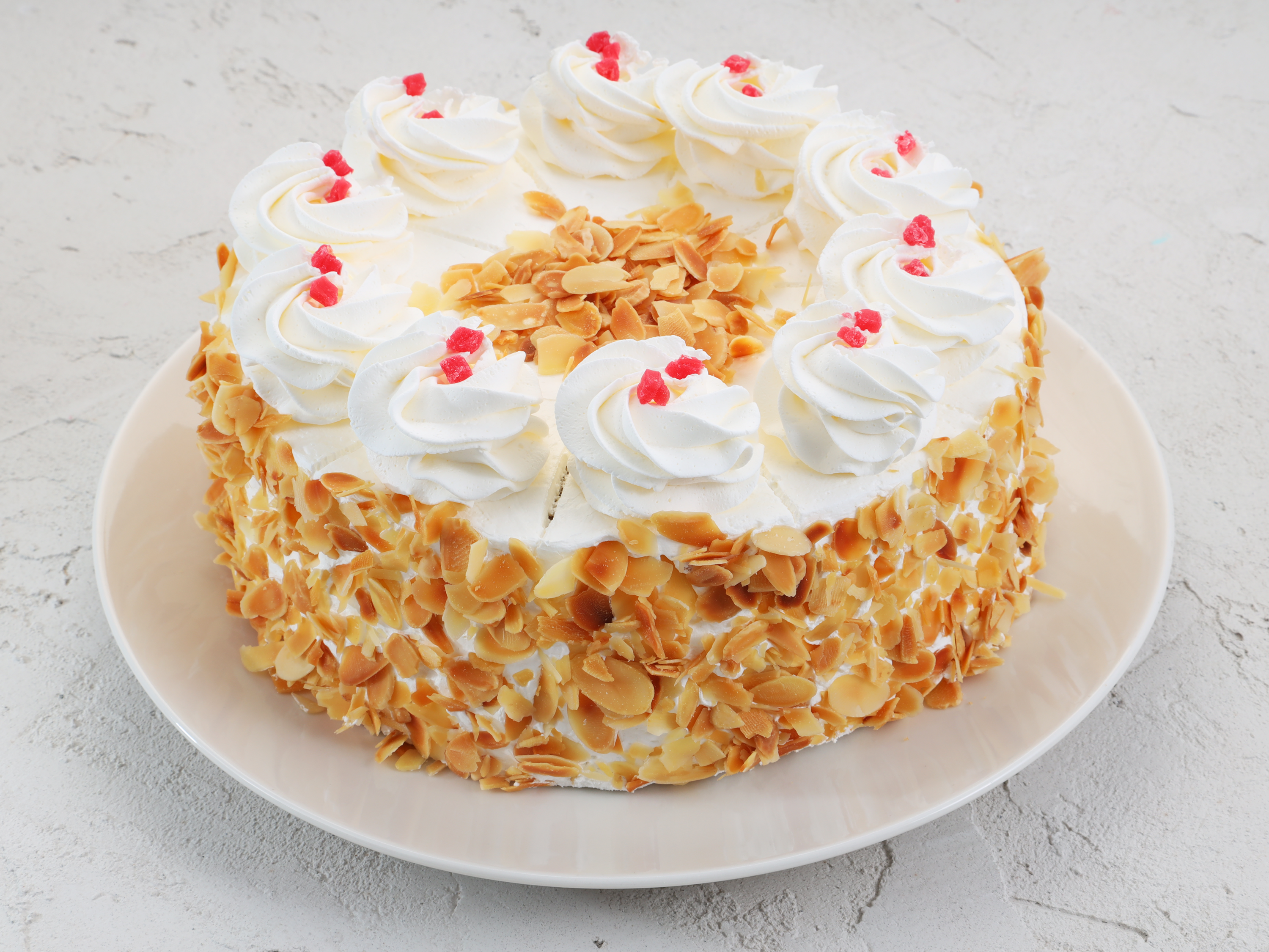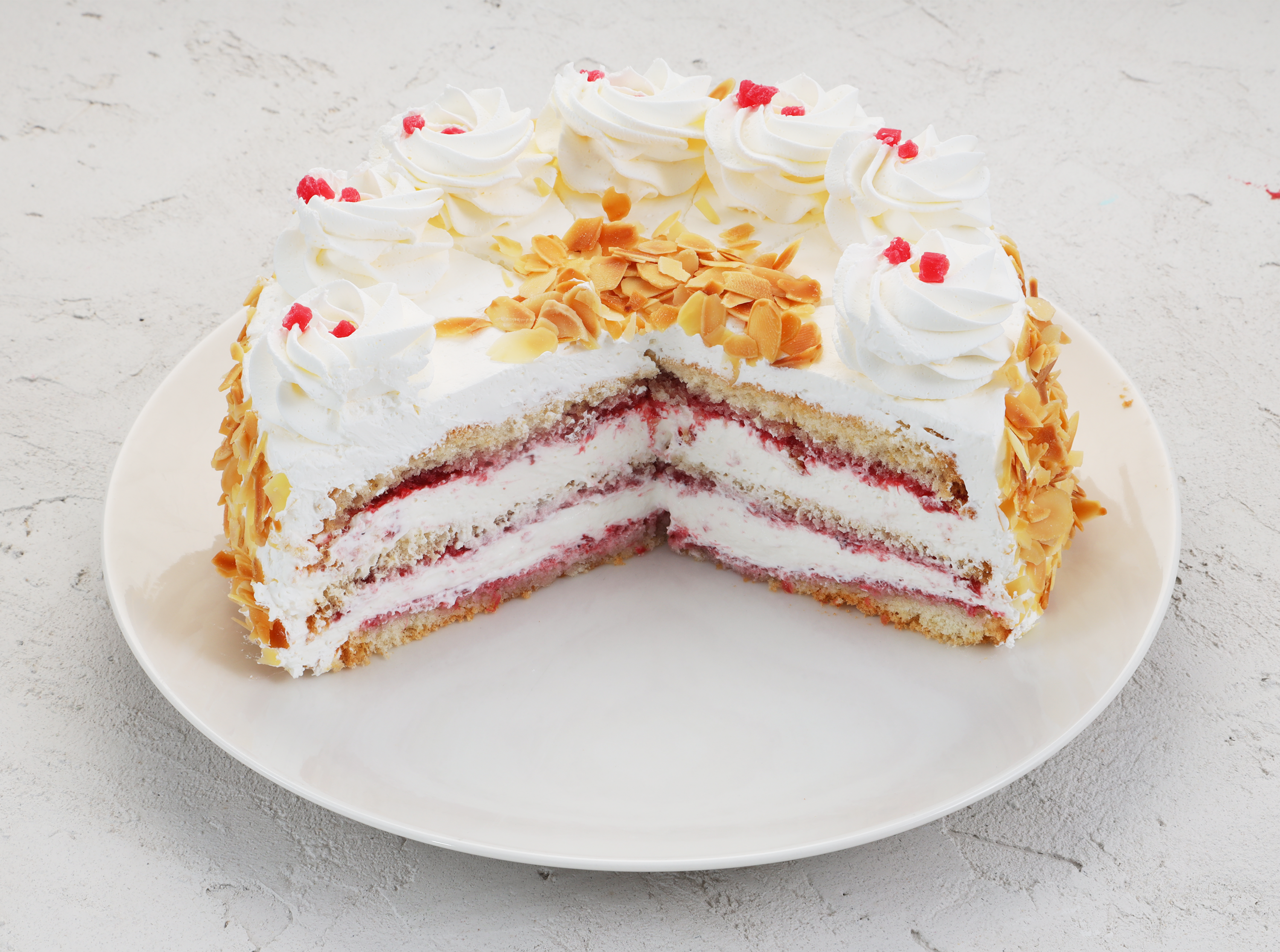 Белые бисквиты, пропитанные перетертой клубникой, в сочетании со взбитыми сливками. Украшен миндальными лепестками и цукатами.