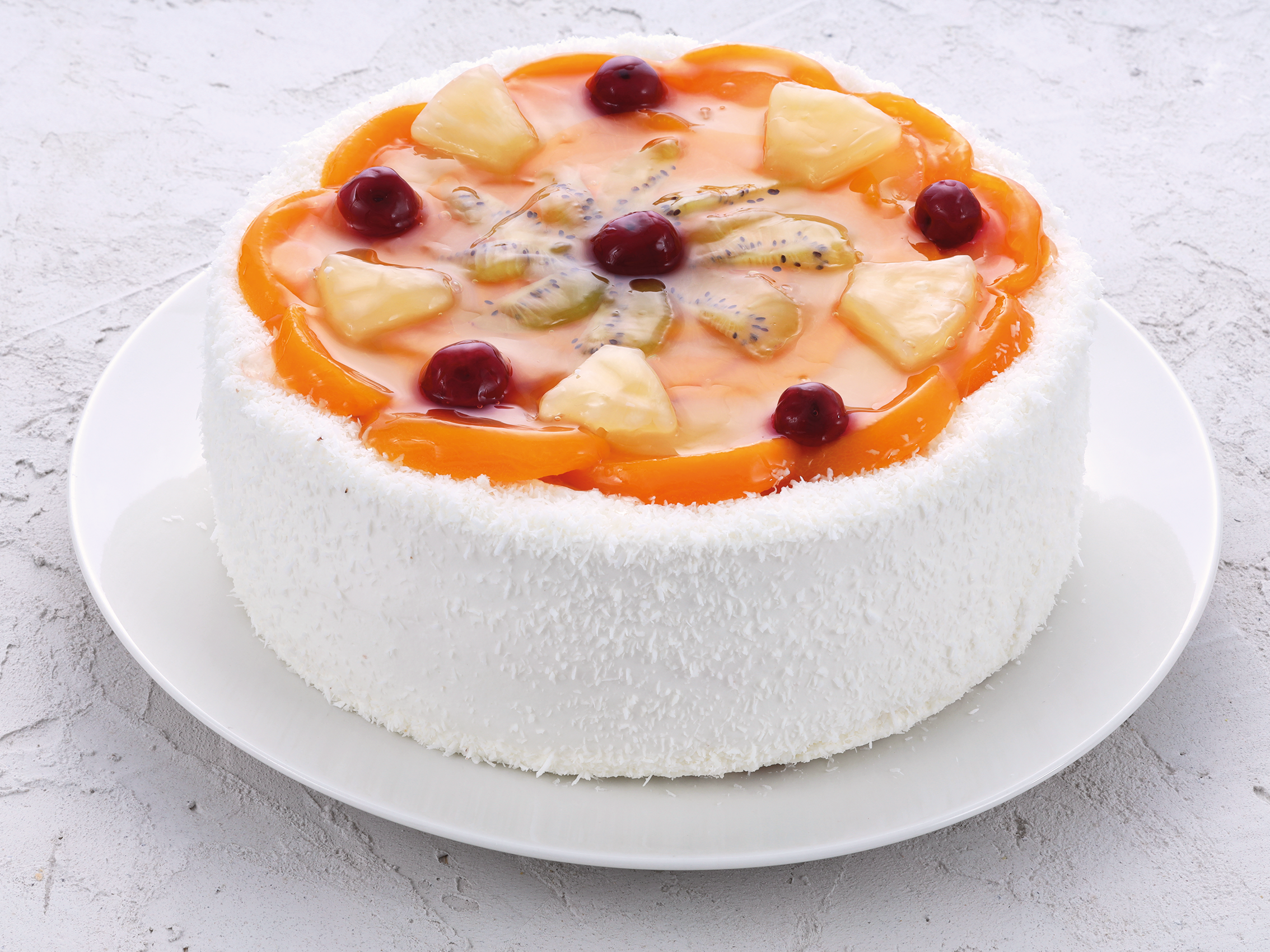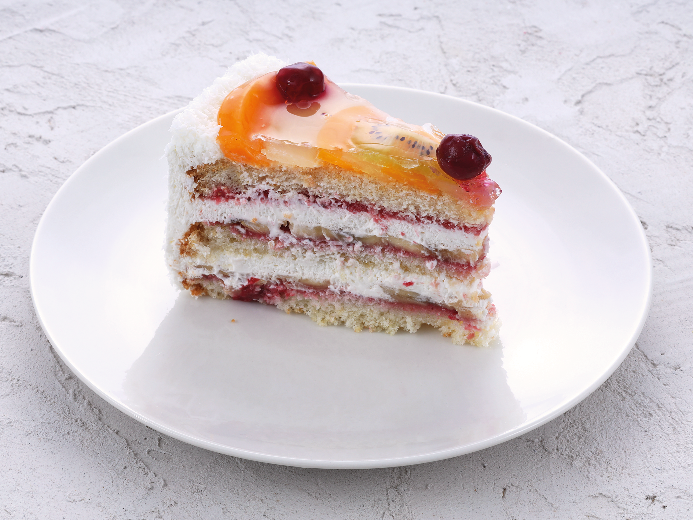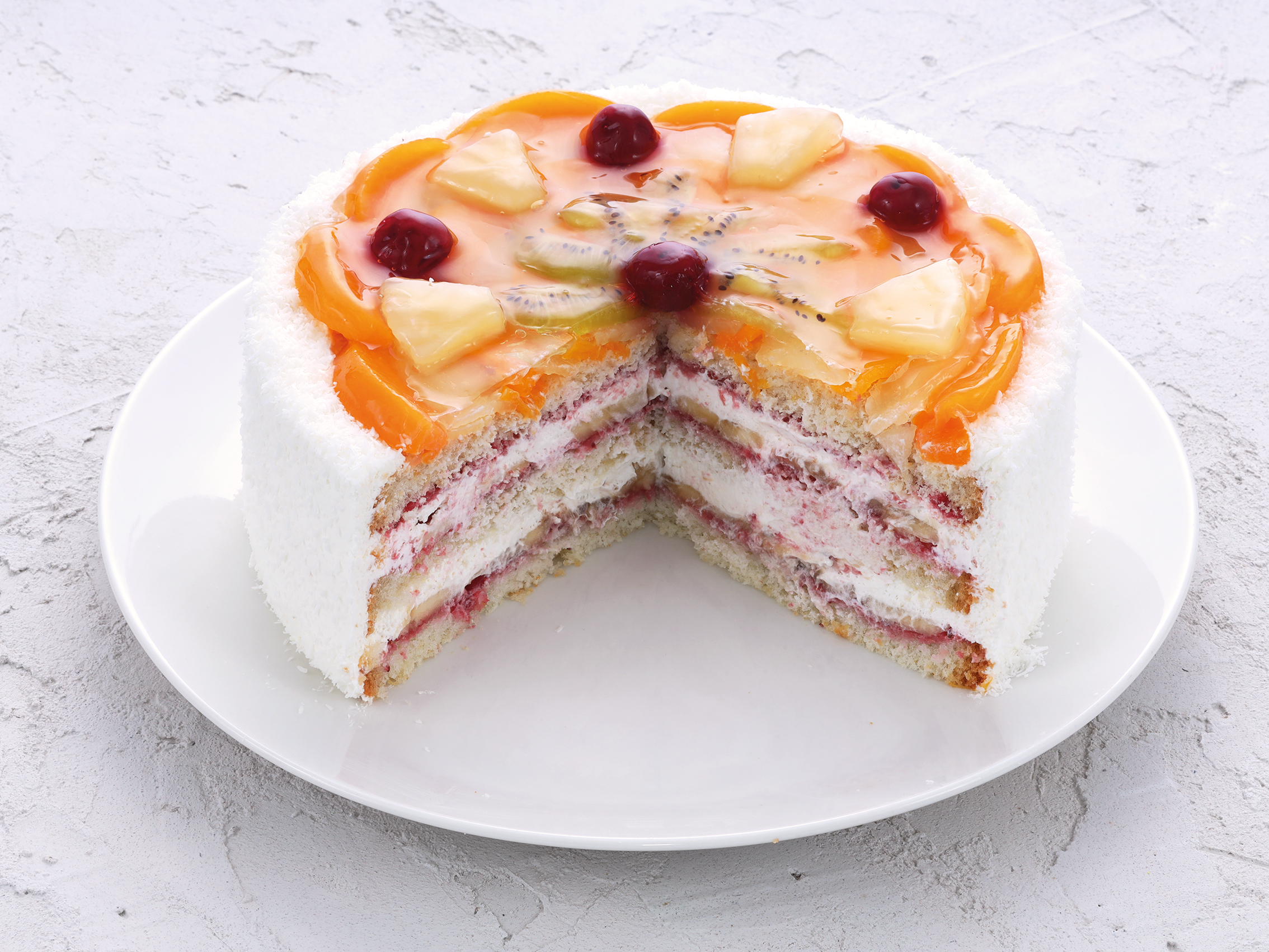 Белые бисквиты, пропитанные клубникой, в сочетании со свежими бананами и кремом из сливок. Покрыт желе с дольками персиков, киви, груши и черешен.