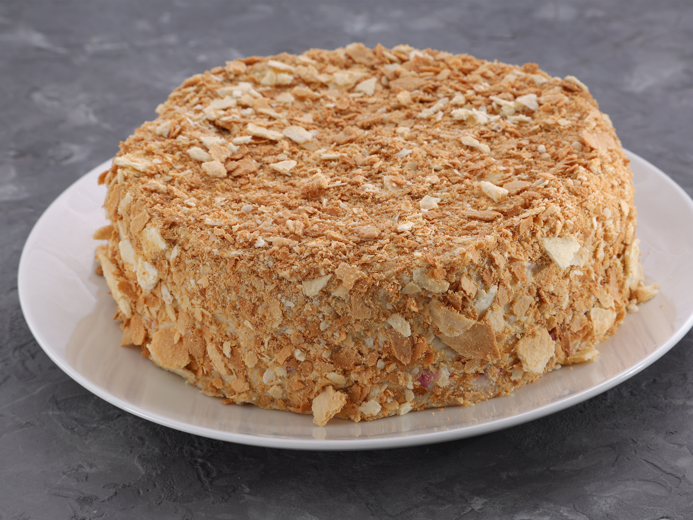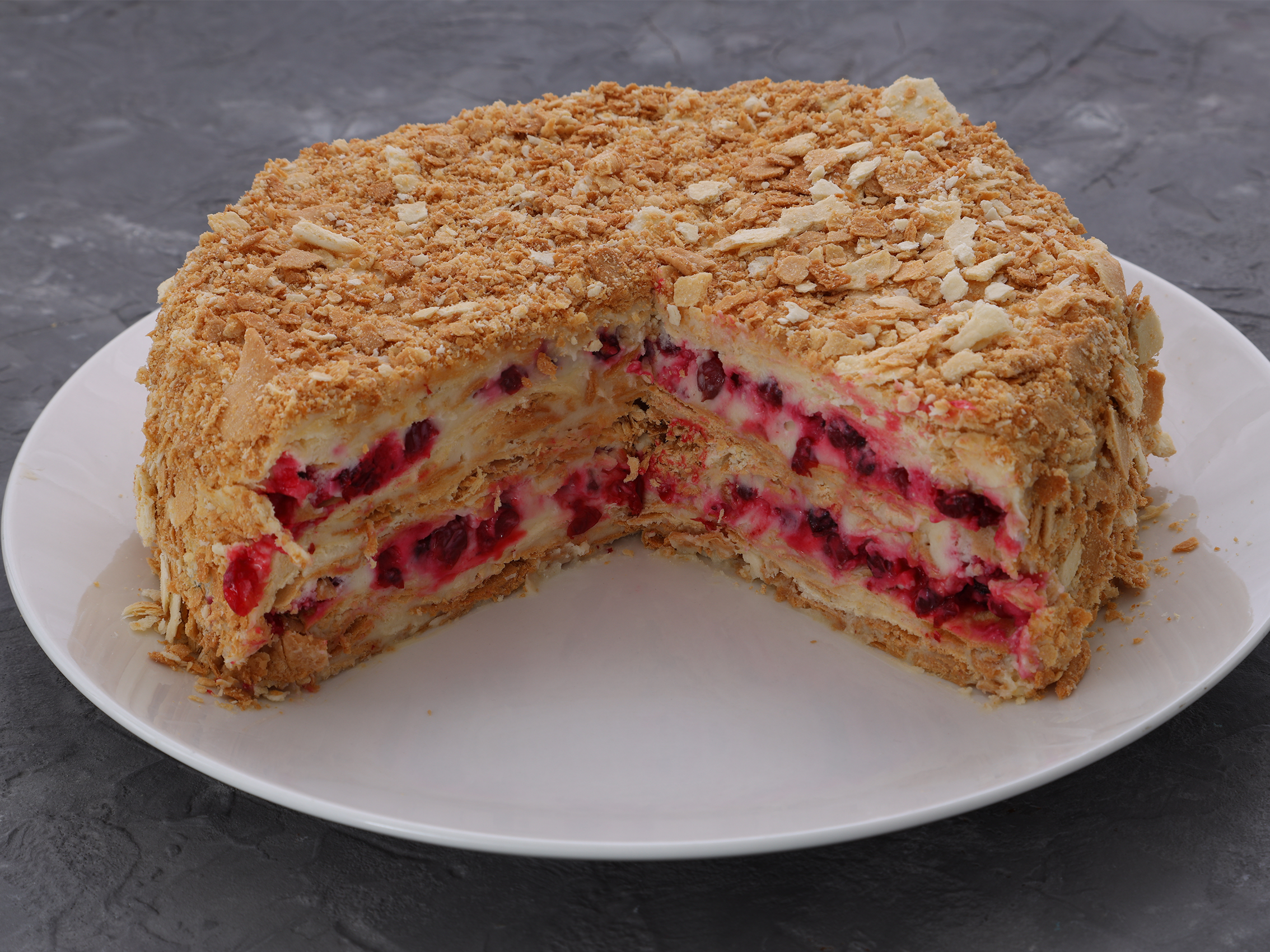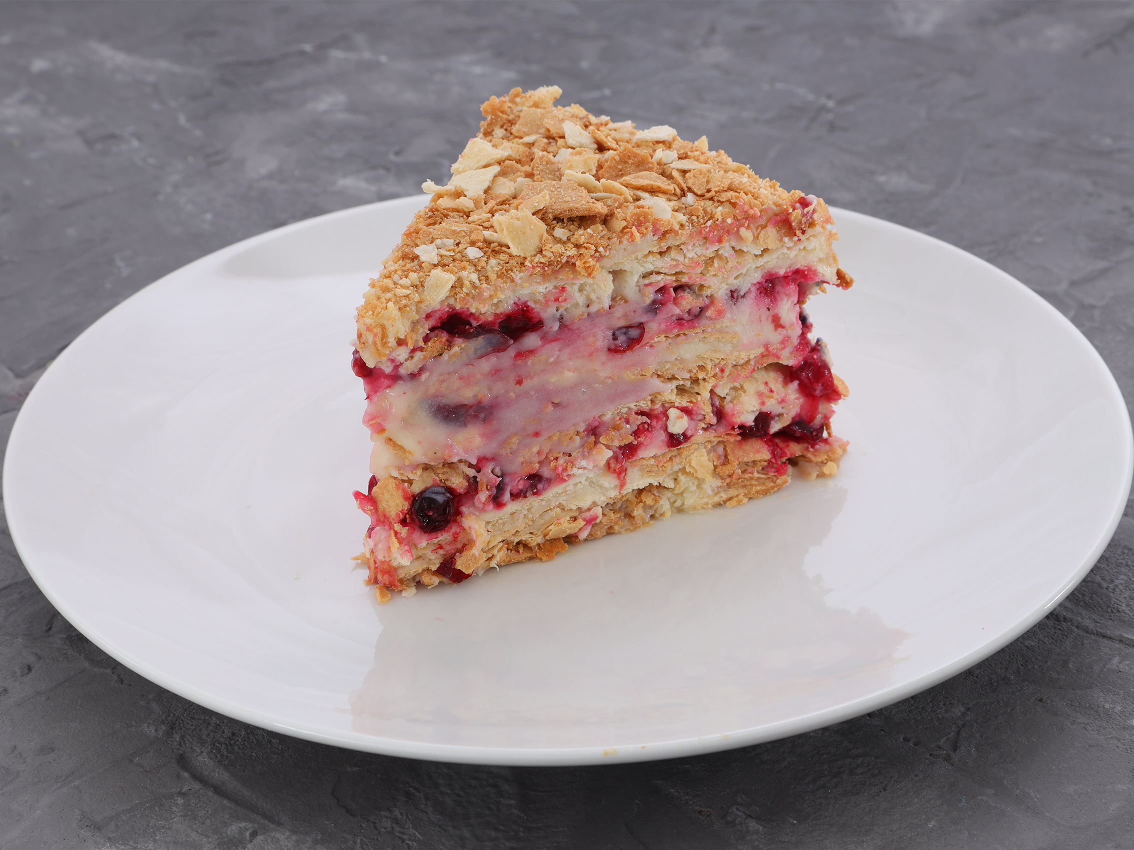 Тонкие слои рубленого слоеного теста в сочетании с заварным кремом с добавлением сгущенного молока, сливочного масла и стручковой ванили. В прослойке выкладывается сочная брусника.