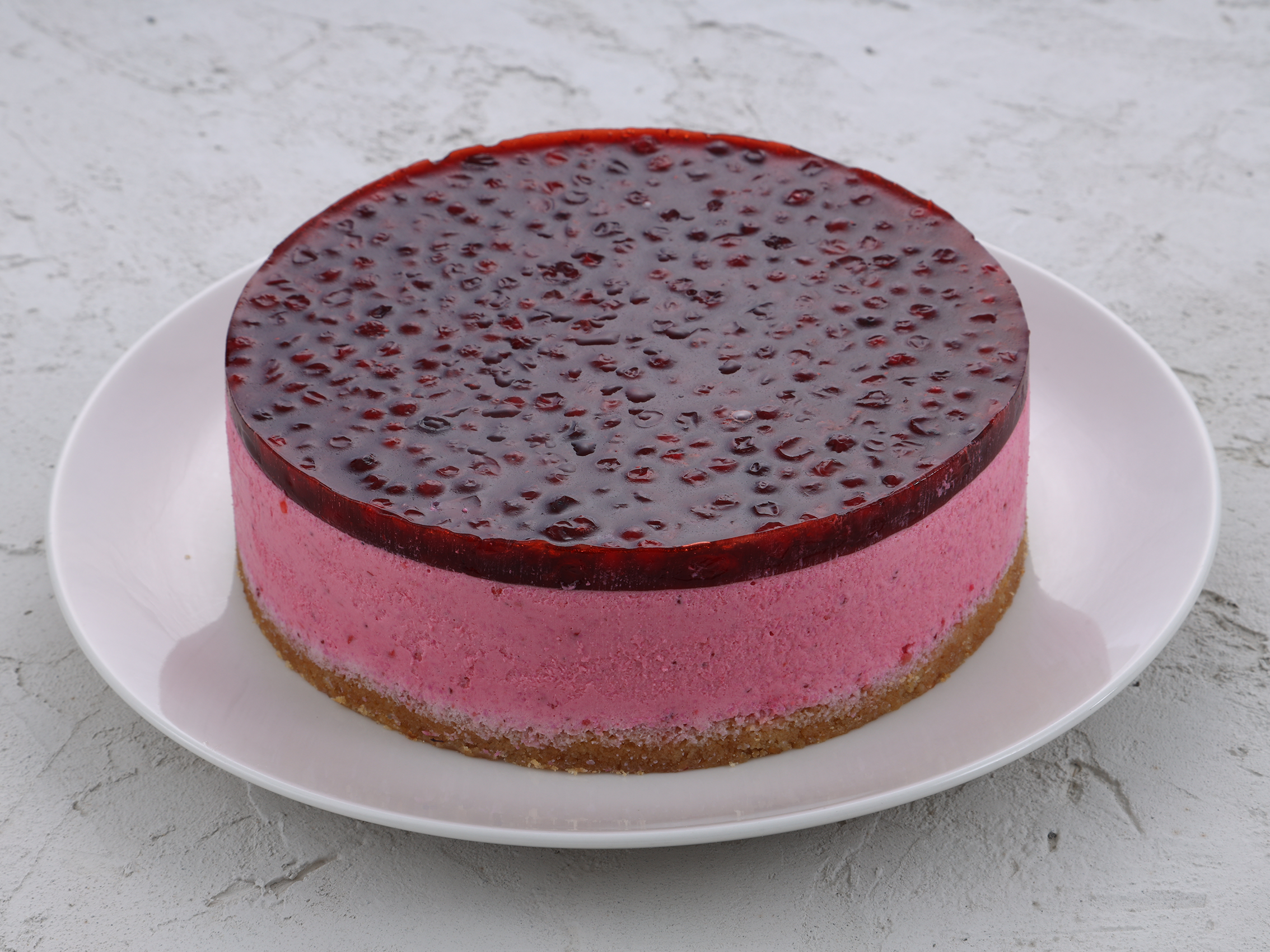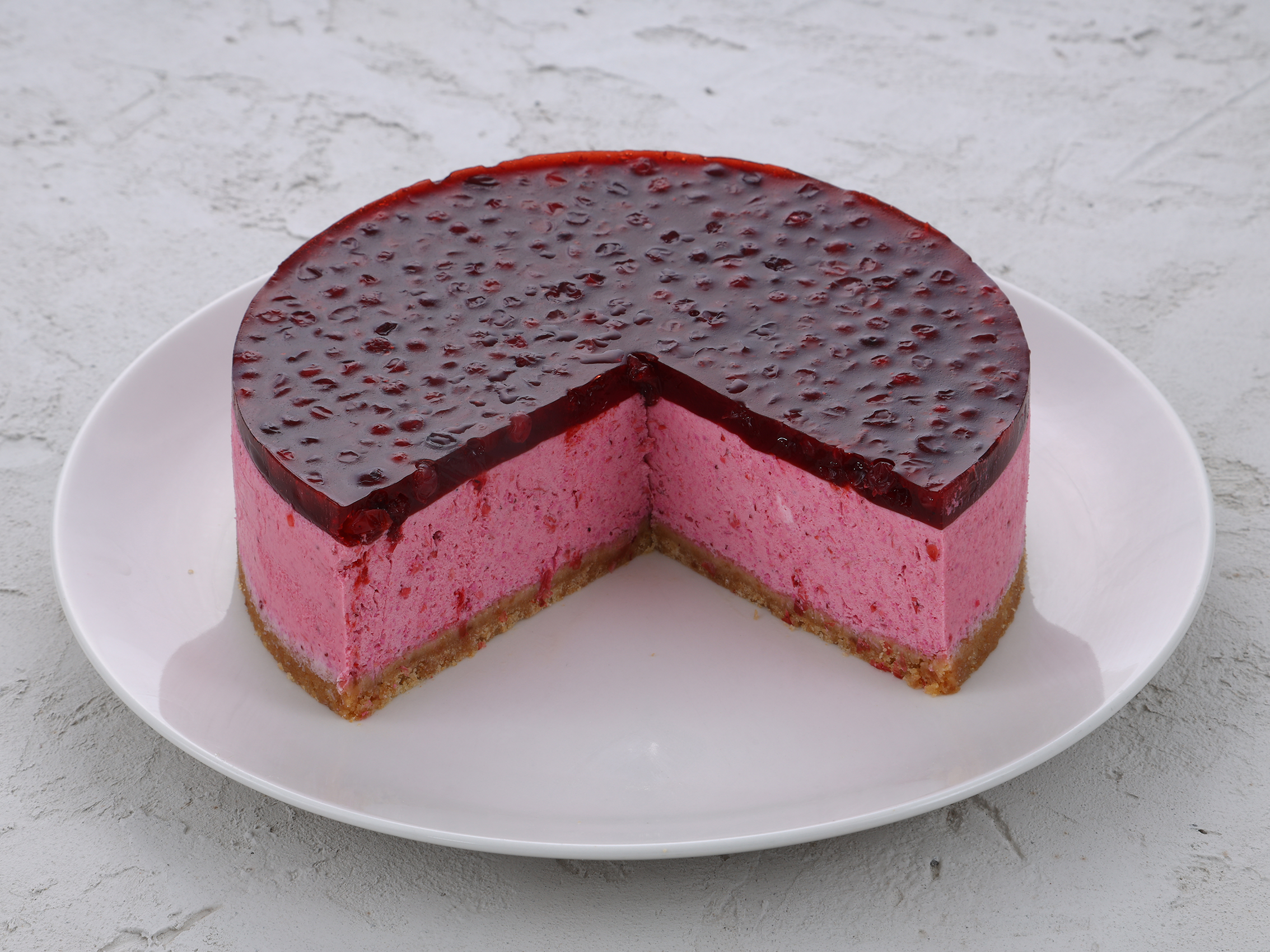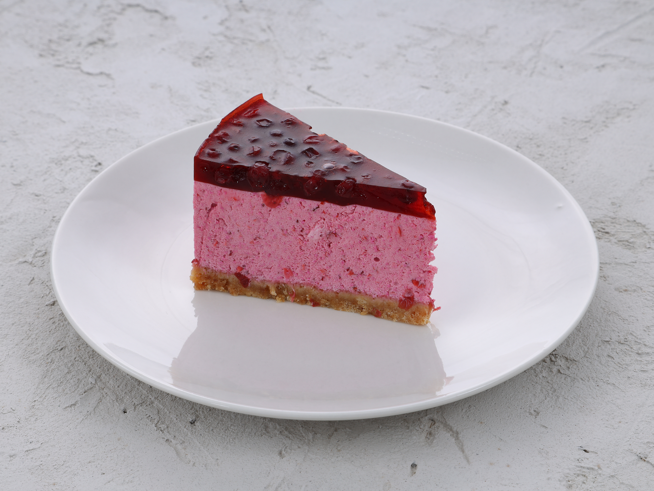 Песочная основа из крошки сливочного печенья, суфле из творога и сливок с добавлением свежей брусники. Покрыт желе и ягодами брусники.