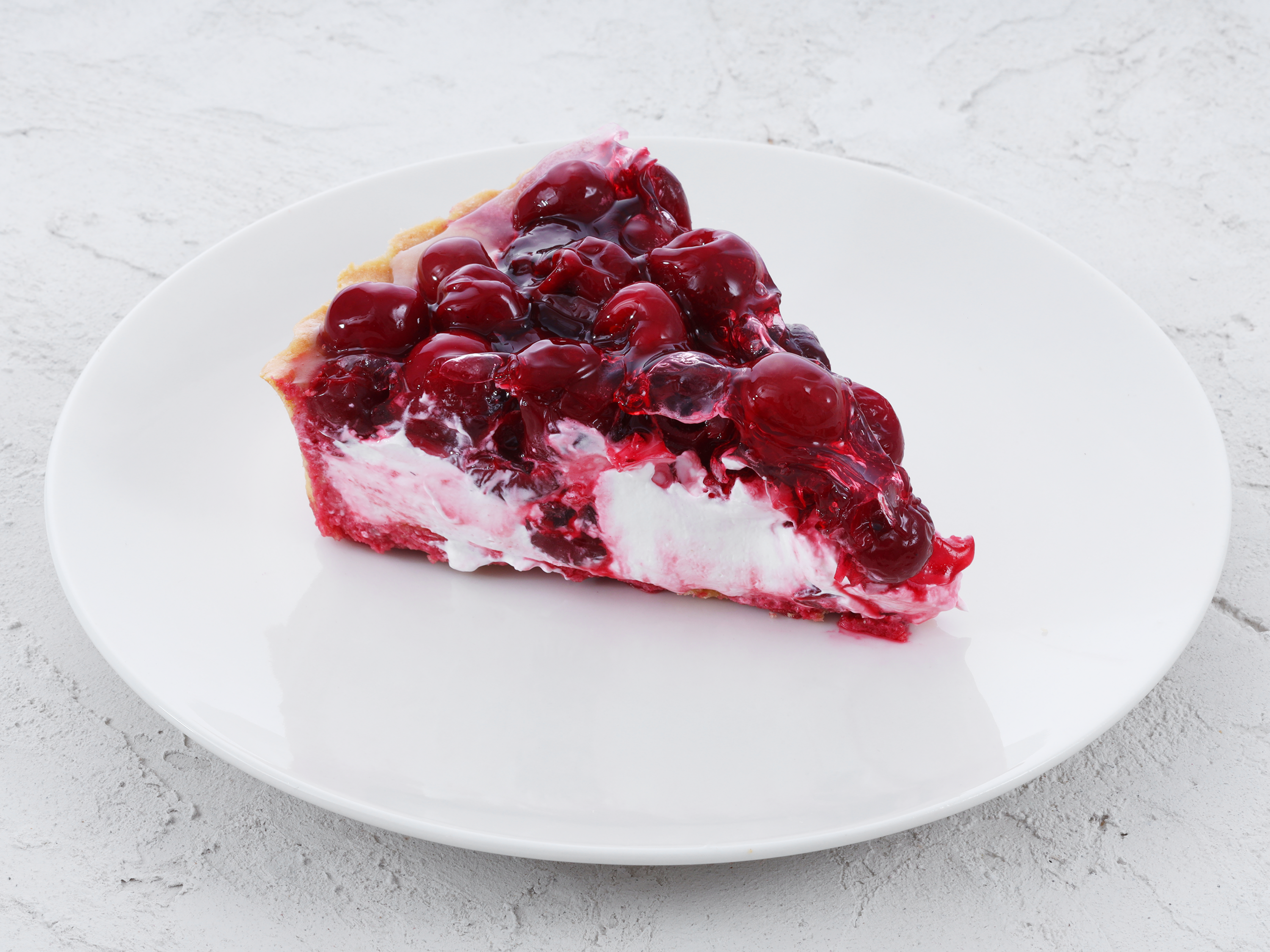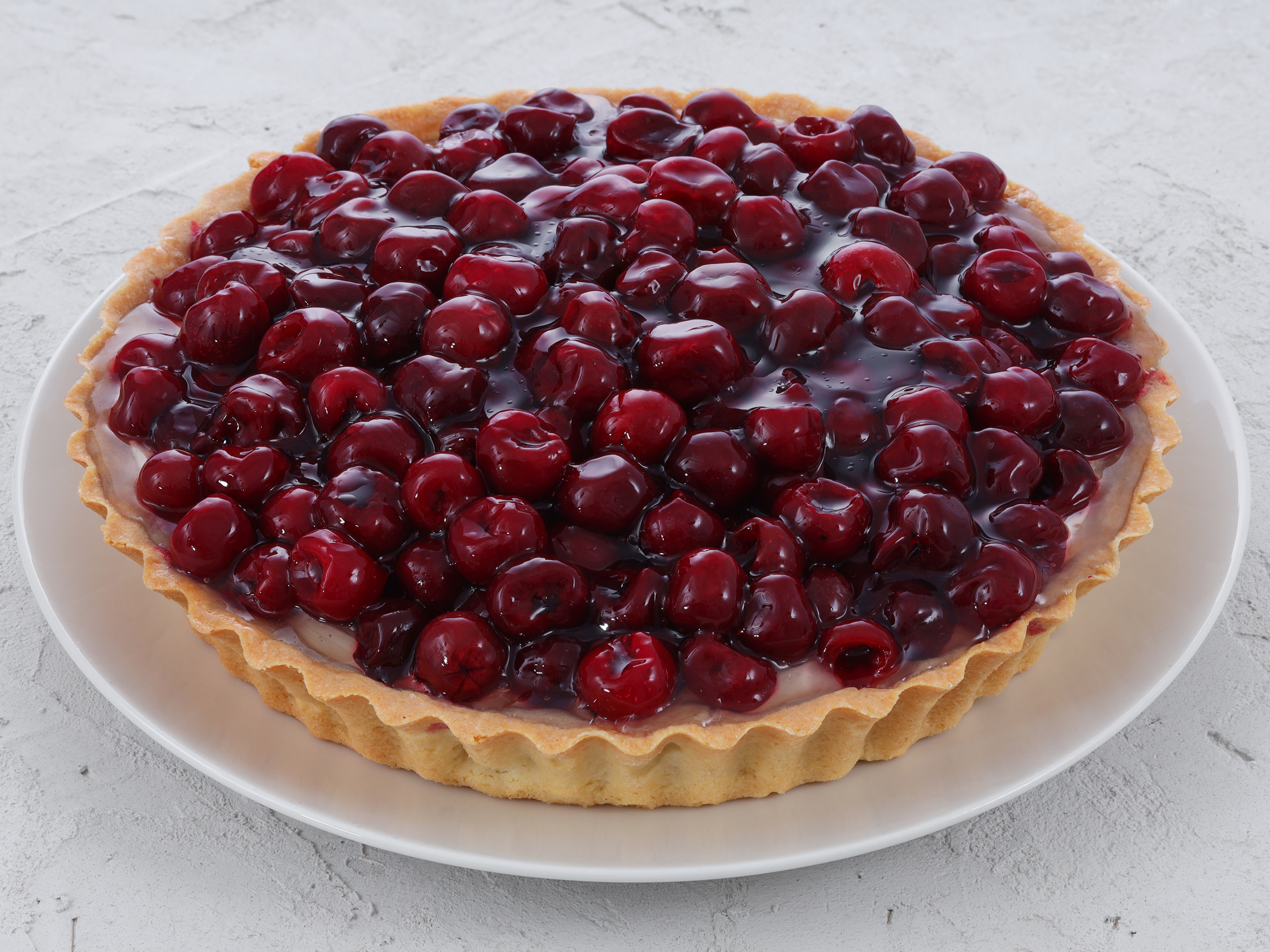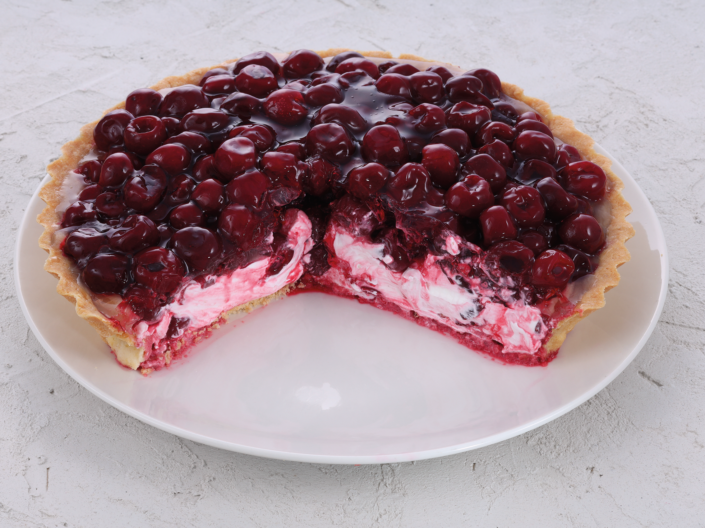 Песочная корзинка с заварным кремом со взбитыми сливками и цельной вишней. Покрыт желе.