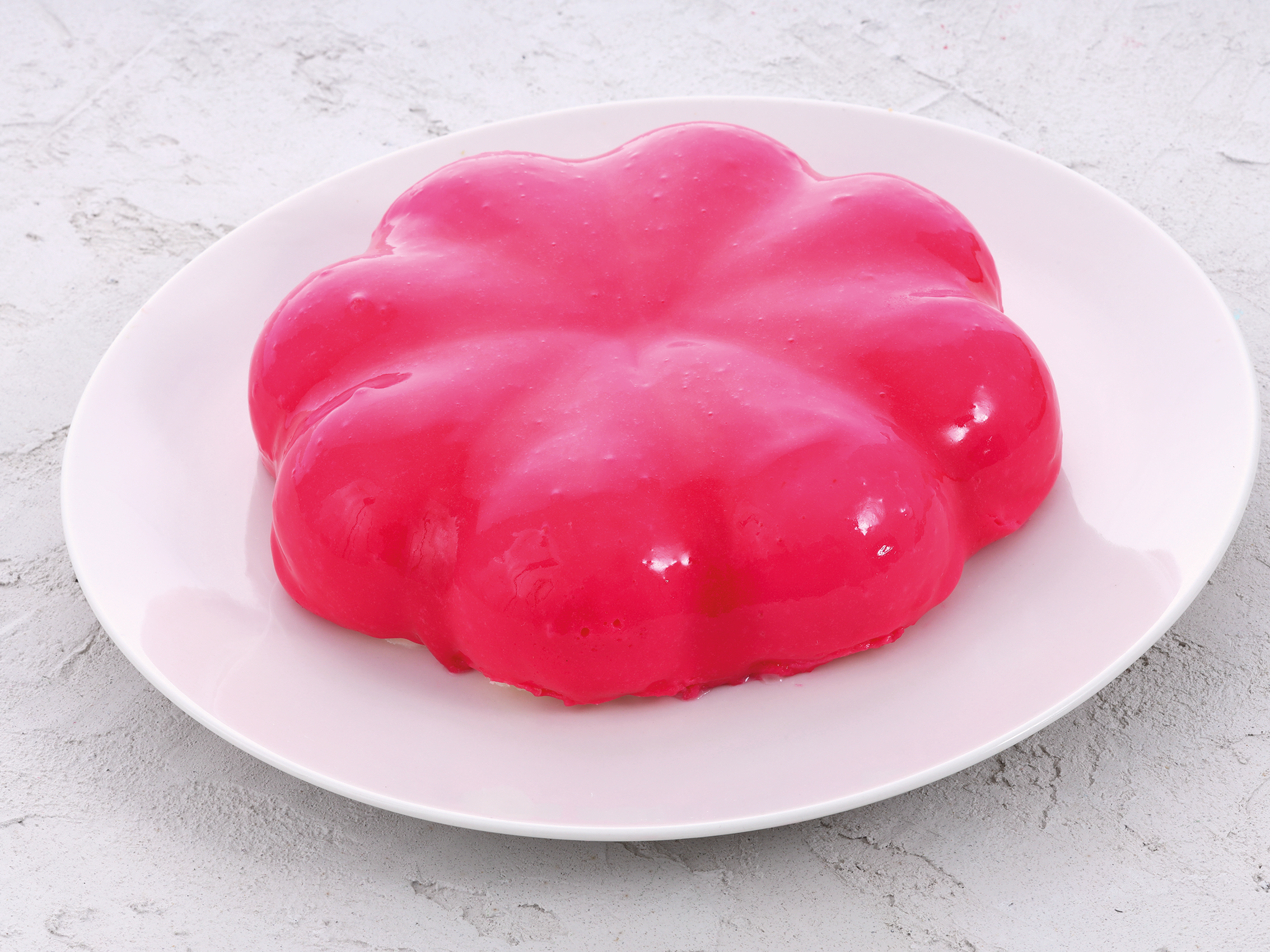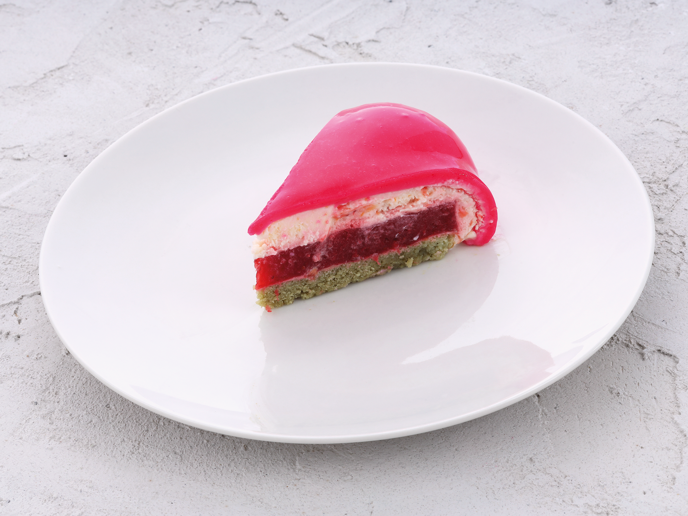 Мусс из грейпфрута в комбинации со сладким клубничным желе на ароматном фисташковом бисквите.